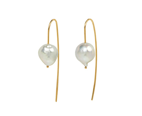 These minimal White/Space earrings are a modern interpretation of the traditional pearl design. The slightly amorphous baroque silver pearls are attached to 14K yellow gold curved ear wires. The versatility of this pair make them the the perfect crossover from casual to formal.