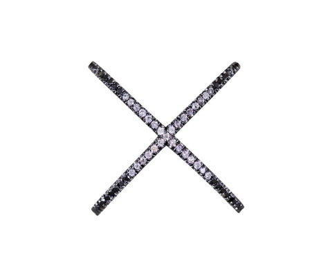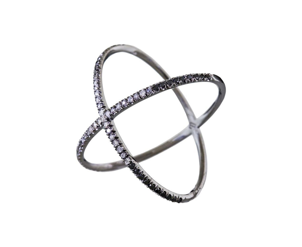 This Eva Fehren ring is an iconic, modern, style-defining piece of jewelry. Inspired by the linear, architectural elements of her native New York City, she has taken a line and created a simple, modern, and miniature wearable sculpture. This 'X' ring is her newest design. The 18K blackened white gold is set with sparkling, clear, gray and black diamonds along the front surface with the lighter stones in the center and the darker ones at the outside points. The first, the original, the style-defining Eva Fehren 'X' ring!