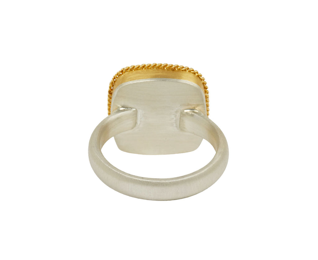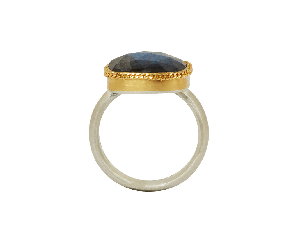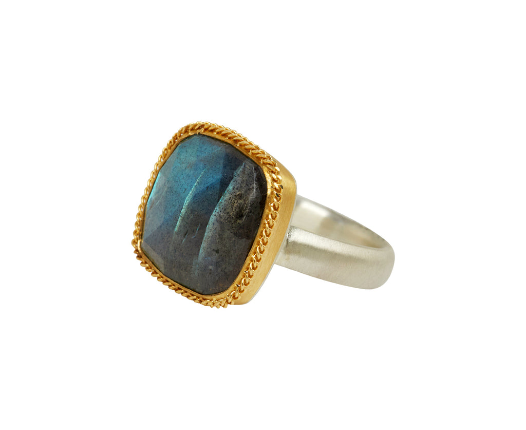 This Amali ring has a stunning, restrained luxury. The square labradorite is covered in beautiful light reflecting facets. It is set in a meticulously hand wrought braided frame of 18K yellow gold with detailed granulation and centered on the brushed sterling silver band. Wear this as a modern alternative to the traditional engagement ring or cocktail ring.