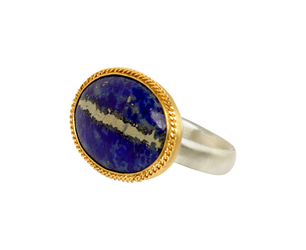 This Amali ring has a stunning, earthy luxury. The large oval lapis is polished smooth to reveal its natural characteristics. It is set in the hand wrought braided frame of 18K yellow gold with detailed granulation and centered on the brushed sterling silver band.