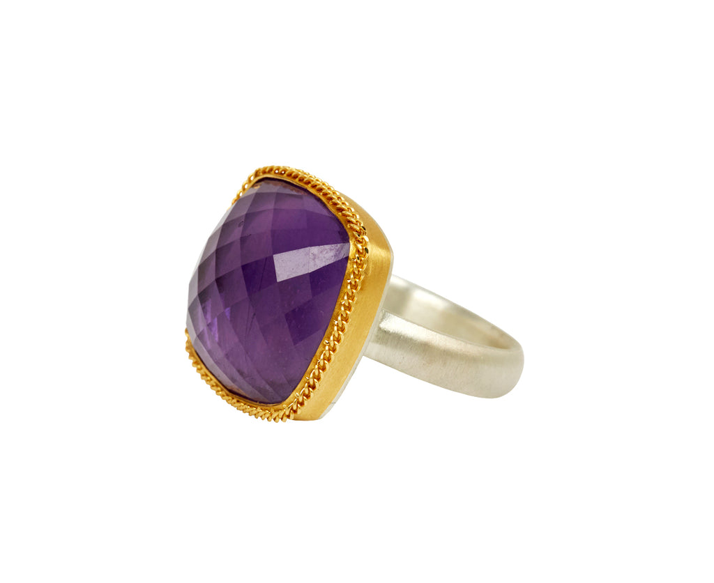 With a gorgeous, regal toned color story, this Amali ring has a stunning, restrained luxury. The square amethyst reveals a dramatic surface, covered in light reflecting facets. It is set in a meticulously hand wrought braided frame of 18K yellow gold with detailed granulation and centered on the brushed sterling silver band. Wear this as a modern alternative to the traditional engagement ring or cocktail ring.