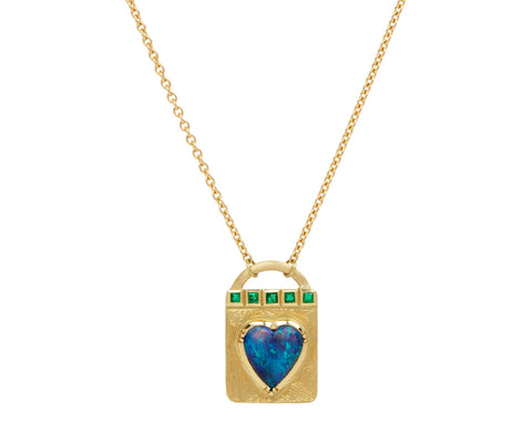 With its statement-making combination of colors and sweet sentiment, this Brooke Gregson necklace is a perfect take on the colored stone pendant. The smooth, heart shaped opal is set in an 18K yellow gold bezel at the center of the engraved 18K yellow gold lock-style pendant beneath five stunning square emeralds. It hangs from the center of the adjustable 18K yellow gold chain and looks perfect whether worn alone or layered.