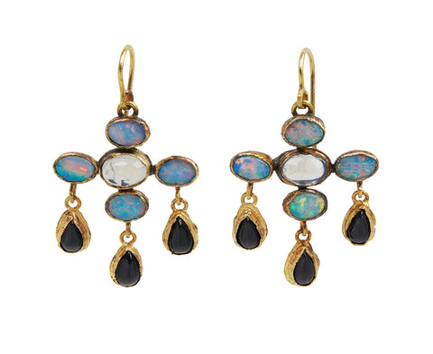 With an earthy sophistication and stark contrast of color, these Judy Geib earrings perfectly display her love of colorful gems and her creative magic. Four oval opals are set in 18K yellow gold bezels and surround the center oval rainbow moonstone. Three tear drop shaped black onyx dangle below for a hint of movement, and the composition hangs from 18K yellow gold ear wires.