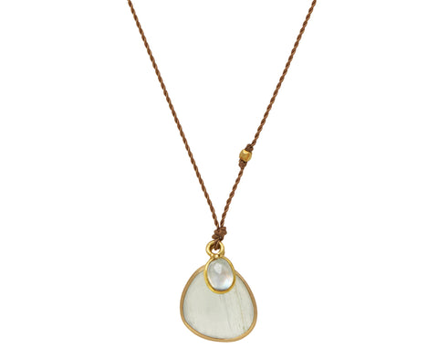With a quiet, earthy elegance and calm, cool-toned color story, this Margaret Solow necklace is the perfect necklace to pair with any casual outfit. The blue aquamarine and smaller moonstone are framed in 18K yellow gold and hang together from the center of the brown nylon cord. A tiny gold bead is woven into one side of the necklace adding a bohemian vibe.