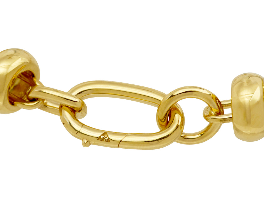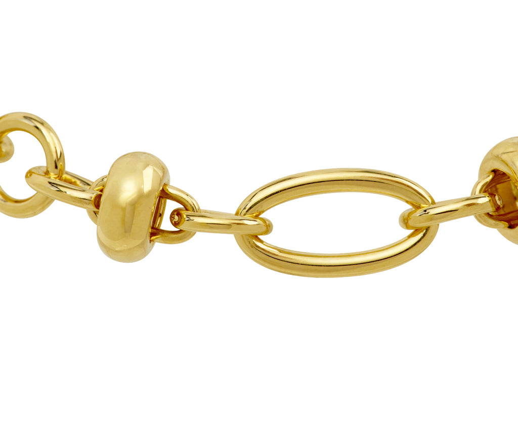 This three dimensional, textural Foundrae bracelet is a modern version of the traditional gold chain. Oval and circular 18K yellow gold links connect to create the continuous strand, while seven polished 18K yellow gold beads accent the composition and spin freely. It closes with an 18K yellow gold lobster clasp and would look perfect alone or layered.