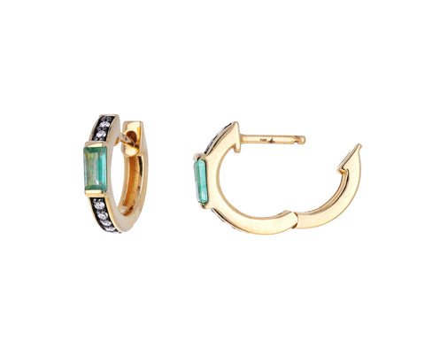 With stunning, playful elegance and sophistication, these Sorellina earrings are a classic. The diamond pavé encrusted front surfaces are blackened and set with emerald baguettes for an unexpected contrast. The 18K yellow gold hoops fasten with post latch closures. These earrings are perfect with everything.