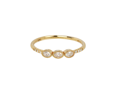 The hint of sparkle and elegant, understated design make this Jennie Kwon ring the perfect symbol of an engagement for someone not used to wearing jewelry. The trio of diamonds is set in the center of the 14K yellow gold thin band which has diamond pavé set just along each side.