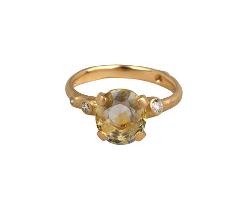 With its molten, amorphous design, this Johnny Ninos ring is a stunning, modern alternative to the traditional solitaire. The oval, untreated pale sage Montana sapphire is nestled in the sculptural 18K yellow gold setting. Bezel set white brilliant cut diamonds sparkle on either side. As stunning as it is edgy and contemporary, it also exudes a confident sense of style.