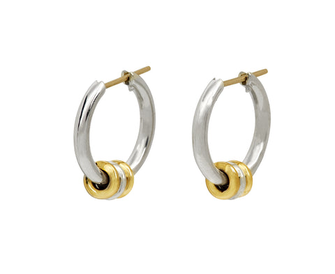 With their perfect scale and modern design, these Spinelli Kilcollin earrings are perfect with any outfit. The sterling silver hoops have a trio of mixed sterling silver and 18K yellow gold rings dangling along them and connect to 18K white gold latch backs.