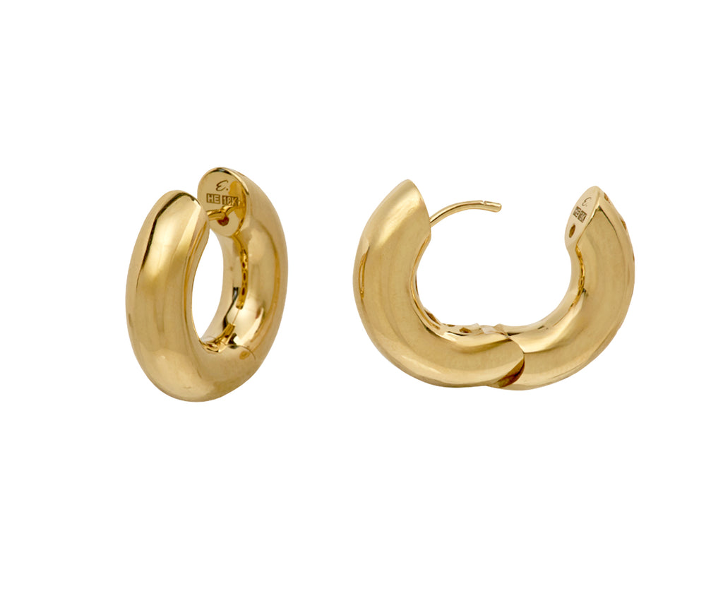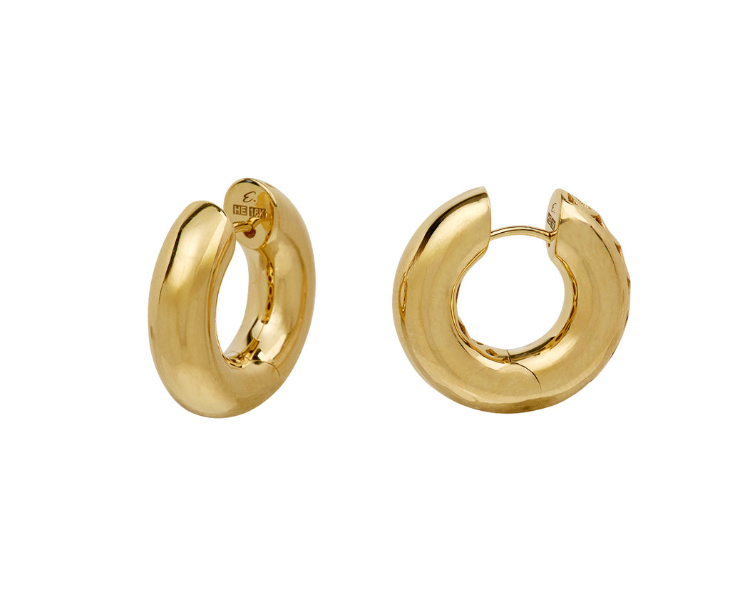 Modern, minimal and easy-to-wear, these Engelbert hoop earrings have a subtly sculptural design. The polished 18K yellow gold hoops have a tubular shape and connect to 18K yellow gold latch backs. Perfect no matter what you wear them with.