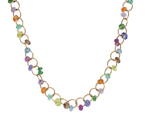 This Mallary Marks circus necklace is a one-of-a-kind, meticulous arrangement of hand-selected stones and colors. Each of the pastel toned beads hang from the hand-formed ring of 18K yellow gold and includes aquamarine, chalcedony, ruby, tsavorite, emerald, mandarin garnet, chrysoprase and tanzanite. The continuous strand of interlocking rings can be paired with absolutely anything you wear.