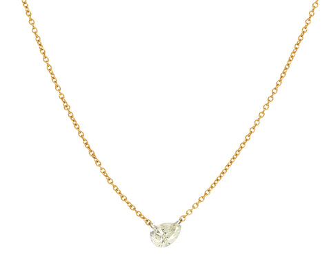 With its barely-there presence and hint of sparkle, this stunning Todd Pownell necklace is a modern interpretation of the traditional diamond pendant. Hanging horizontally from the center of 18K yellow gold chain is a pear shaped diamond (.51ct). It connects to the chain with tiny platinum rings. Perfect alone or layered with your other favorites.