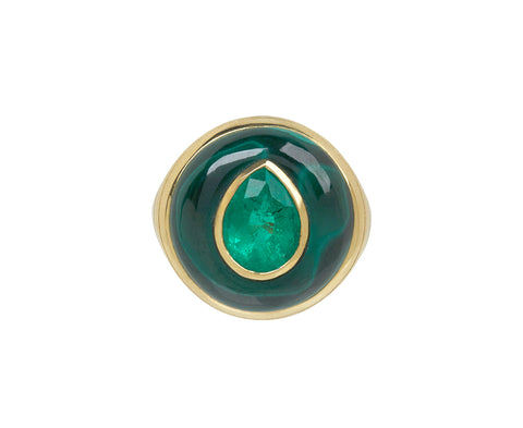 Perfectly balancing earthy, monochromatic color with modern design, this Retrouvai ring has a statement-making style. Set at the center of the smooth, deep green malachite is a pear shaped, vibrant emerald bezel set at its center. The composition is set in 14K yellow gold at the center of the polished 14K yellow gold band.
