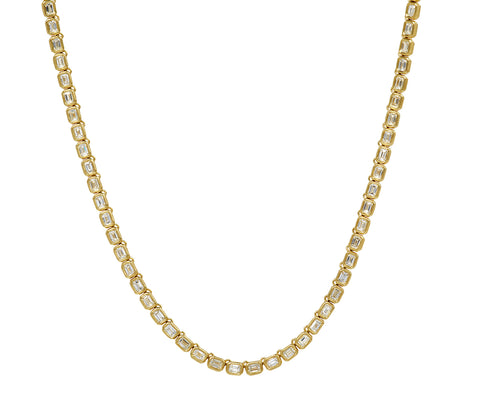 Shimmering and statement-making, this Octavia Elizabeth necklace sits perfectly around the collar to create an earthy take on the traditional diamond tennis necklace. Each emerald cut white diamond is set in an 18K yellow gold bezel and connect to create the fluid strand. It closes with a custom 18K yellow gold box safety clasp.