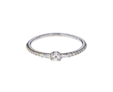Stunnning in its classic, traditional and timeless design, this Ila ring is meant to symbolize forever and is a more discreet version of the Diamond Parson Ring. The small, sparkling center diamond is a round rose cut set in 14K white gold prongs. Two tapered diamond baguettes are set on either side of the white gold band with diamond pavé covering its top surface. Pair it with one of Ila's bands and your set is complete.