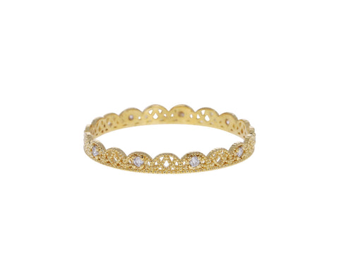 Echoing the intricate pattern of delicate lace, this Grace Lee ring exudes a quiet, restrained sophistication and elegance. The 14K yellow gold ring is a tightly woven mesh with a subtly beaded surface and crown-like top. Within the delicately woven gold are white diamonds that surround the band with subtle sparkle.   Whether it is added to a stacking collection or worn to symbolize a wedding, it has a classic, timeless appeal. Add it to another one of Grace Lee's rings for a truly personal look.