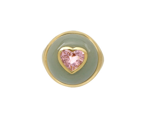 With its sweetly symbolic design and combination of colors, this statement-making Retrouvai ring is a stunning take on the traditional cocktail ring. The smooth, sage green aventurine is set with a pale pink tourmaline heart bezel set at its center. The composition is set in 14K yellow gold at the center of the polished 14K yellow gold band.