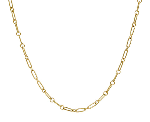 With its small scale and minimal design, this Marlo Laz chain is the perfect backdrop for one of her pendants. The thin, 14K yellow gold oval and round links alternate to create the short strand. It closes with a 14K yellow gold lobster clasp.