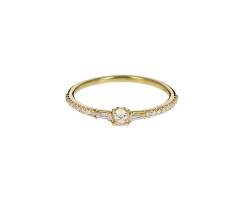 With a design that combines classic elegance with feminine style, this Ila ring is a perfect way to commemorate a commitment or engagement ceremony. The shimmering round rose cut diamond is nestled between two tapered baguette diamonds and centered on a 14K yellow gold and diamond pavé band. Exquisite in its understated simplicity, this is a ring that will represent forever!