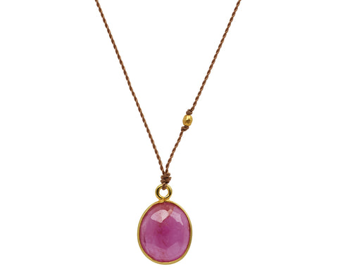 With its warm, understated color, this Margaret Solow necklace has an endless versatility and can easily cross the line between casual and more formal. The drop of pink sapphire is covered in a surface of light reflecting facets to reveal its natural tones and intriguing characteristics. It is framed in 18K yellow gold and hangs from the center of the brown nylon cord.