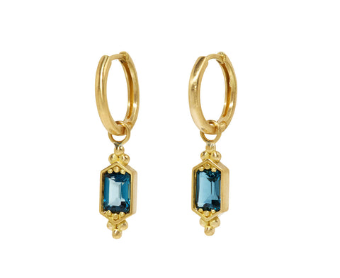 Wear these Pari hoop earrings as a cool toned take on the traditional hoop earrings. The 18K yellow gold mirror designs is set with a rectangular blue topaz center and hang from the 18K yellow gold hoops. Ideal for everyday, they connect to 18K yellow gold latch backs and are endlessly easy to wear.
