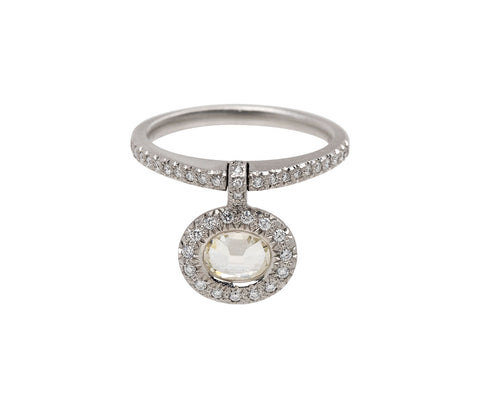 With its stunning details and intense sparkle, this hum ring is a statement-making take on the traditional diamond solitaire. The oval, pale yellow diamond is set in the platinum and diamond bezel and hangs loosely from the platinum and diamond band. This ring is perfect for the person with a modern, edgy sense of style.