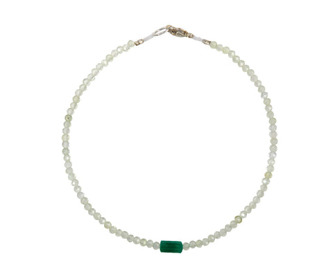 With its cool toned understated color, this Margaret Solow bracelet can be nestled right into your bracelet stack. The tiny faceted prehnite beads have a subtle shimmer and are set around a larger emerald for the perfect contrast in color and texture.