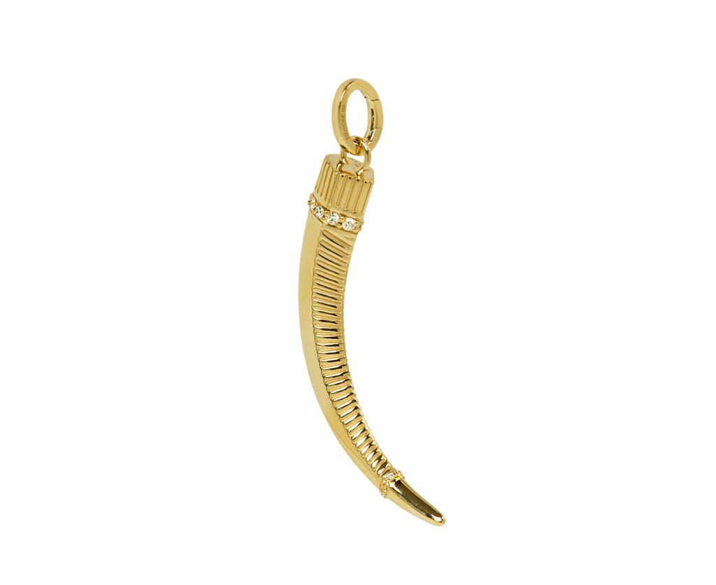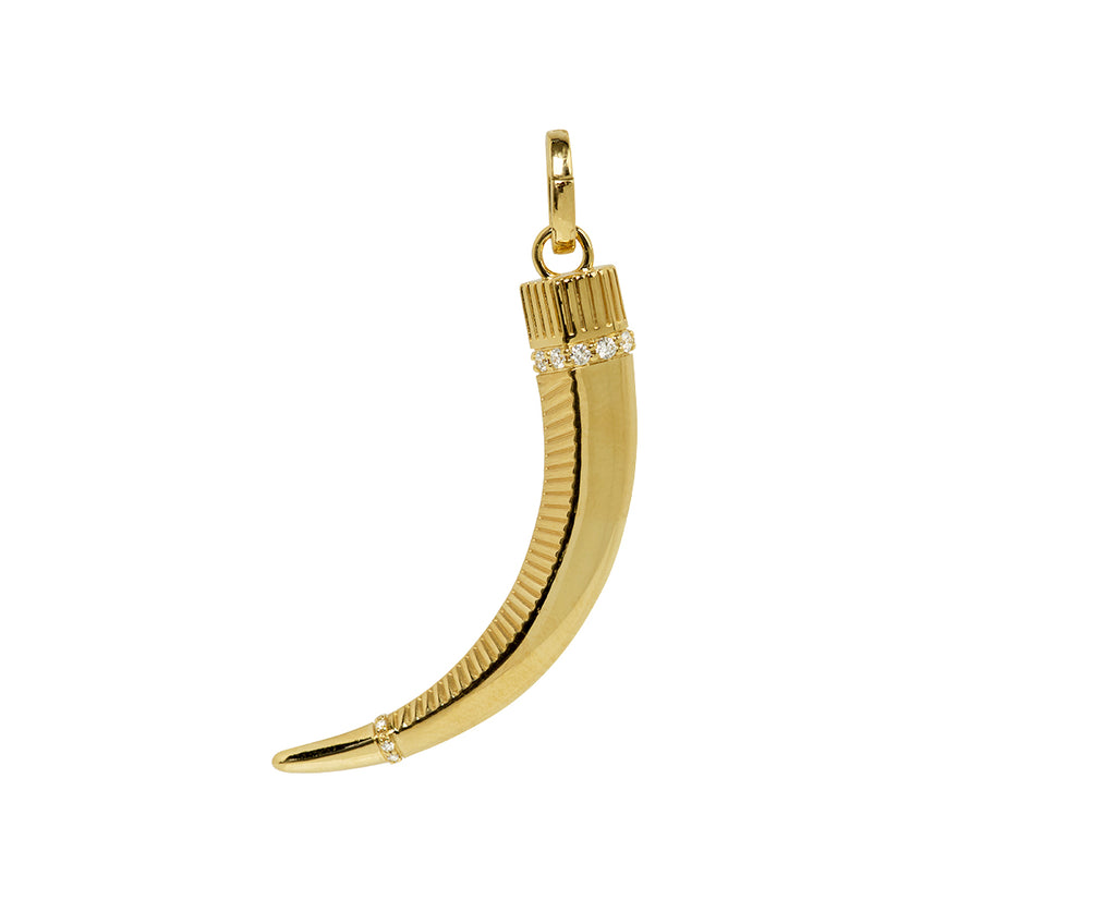 This subtly sparkling Foundrae pendant is the perfect reminder to trust your primal instincts. The 18K yellow gold claw has an engraved interior and two rows of shimmering, white diamonds. It hangs from the 18K yellow gold push gate bale and would look perfect whether worn alone or clustered with your other favorites.