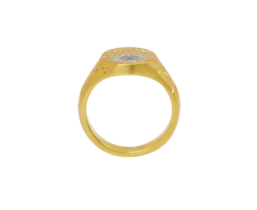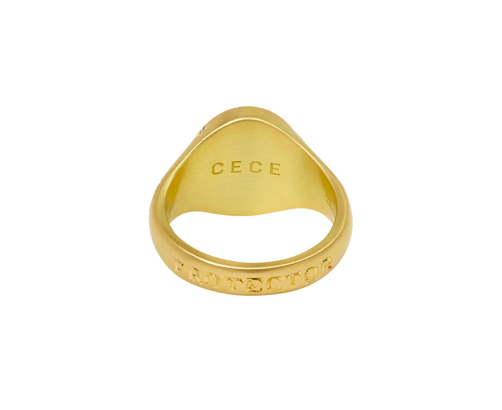 Wear this stunning, hand-painted Cece Jewelry ring as a subtle, simple way to symbolize your inner protector. The oval, 18K yellow gold signet ring face has been engraved with a tiny, shimmering hamsa and painted with a tiny evil eye. Two flickering candles and extra star set diamonds are set on the sides of the ring, while engraved on the back of the band is the word 'protector.