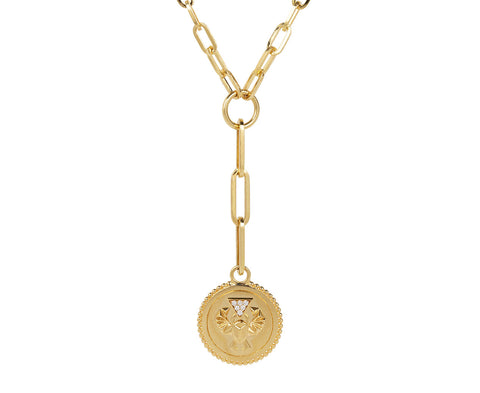 Wear this Foundrae pendant necklace to protect yourself from negativity and allow yourself to build a more productive and positive life. The 18K yellow gold medallion hangs at the base of the extended clip extension which hangs from the refined clip chain. The small, open wings scarab sits at the center of the pendant, with one diamond set inverted triangle directly above it. Modern and substantial, this necklace is perfect alone or layered with your other favorites.