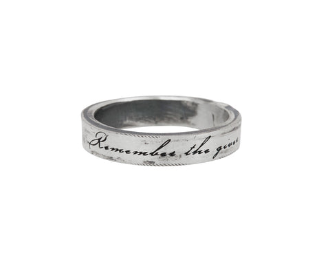 Upon first glance this Tó Garal ring is the a perfectly simple silver ring. However when looking closer at the sterling silver band you can see the words 'remember the giver', creating a stunning, symbolic ring. Wear it alone or stacked with your other favorites.