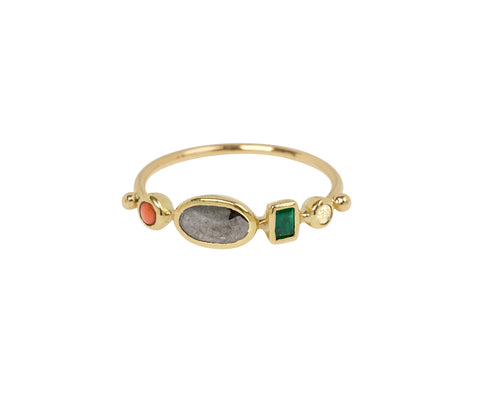 With its cool color palette and minimal design, this Dorette ring is perfect alone or stacked with your other favorites. Each of the stones - including emerald, red jasper and diamond - is meticulously set in an 18K yellow gold bezel in between two tiny gold beads on the thin 18K yellow gold band and backed with sterling silver.