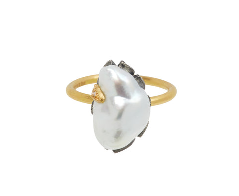 Elegant and distinctive, this Shinkai ring has an earthy, understated sophistication. The amorphous South Sea pearl has a stunning natural nacre and shape. It is held at the center of the matte, rounded 18K yellow gold band by a diamond set oxidized sterling silver crown. It exudes a stunning, statement-making presence.