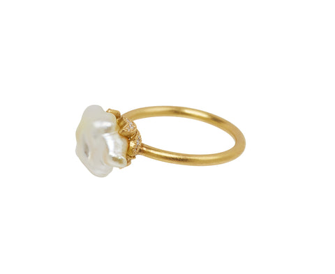Bold and elegant, this Shinkai ring is all about the natural, organic beauty of the cultured pearl. Luminous with its bright white nacre, it is front and center of the 18K yellow gold band and cradled by a 18K yellow gold and diamond pavé setting. This striking ring is as style-defining as it is statement-making. A modern cocktail ring.