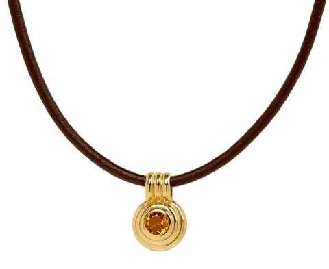 With its earthy-meets-modern design, this Beck Jewels necklace has an understated sophistication. The warm, yellow citrine is covered in facets and set at the center of the polished 18K yellow gold pendant. The ridged, three-dimensional pendant hangs along the short brown leather. This necklace can truly carry an outfit whether worn alone or layered.