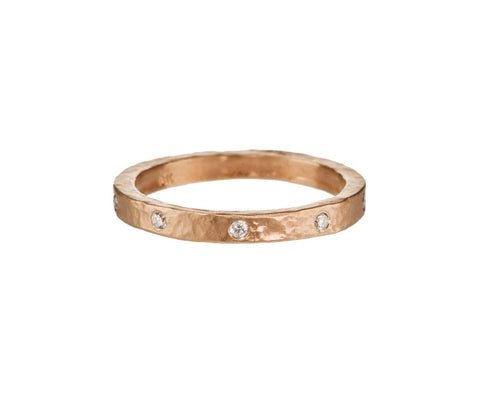 With just a hint of sparkle, this Mandrel Studio band is modern, straightforward and perfect for the minimalist. The hand-hammered band is hand-fabricated from 18K rose gold and is flush set with three sparkling diamonds. It has a distinctive sophistication worn alone, but becomes complete with one of Mandrel Studio's fabulous engagement rings.