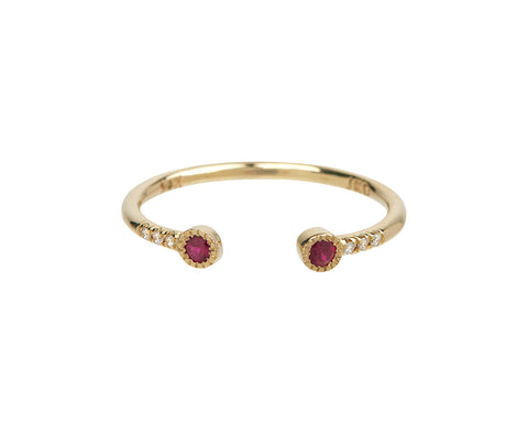 Modern, minimal and with a hint of sparkle, this Jennie Kwon ring exudes a quiet, understated style. The half round band of 14K yellow gold forms an open cuff with two round deep red rubies bezel set in yellow gold with a subtly textured edge. Three tiny round diamonds are flush set next to the sapphires. Add it to a stacking collection or wear it as a symbol of an engagement, marriage or commitment.