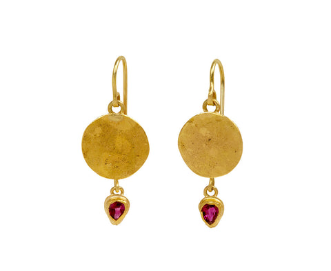 Small, but mighty, these Judy Geib earrings are an eye-catching combination of colors and rich gold. The pear shaped rubies are covered in surfaces of light reflecting facets and are framed in 18K yellow gold. They dangle below the flat 22K yellow gold 'squash' discs which connect to the 18K yellow gold ear wires.