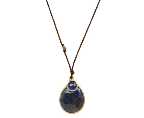 With its quiet, cool-toned color story, this Margaret Solow necklace exudes a casual, effortless style. The faceted larger blue sapphire is framed in a thin band of 14K gold and hangs along the small, cabochon sapphire framed in a thin band of 18K yellow gold. They hang from the center of the nylon cord.
