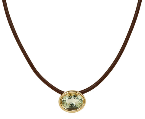Influenced by the engineering and creativity of Jacques Cousteau, this Beck Jewels necklace perfectly represents luxurious, bohemian design. The oval, pale green amethyst is covered in facets and set in the smooth, polished 18K yellow gold scuba pendant. The ridged, three-dimensional pendant hangs along the short brown leather. This necklace can carry an outfit whether worn alone or layered.