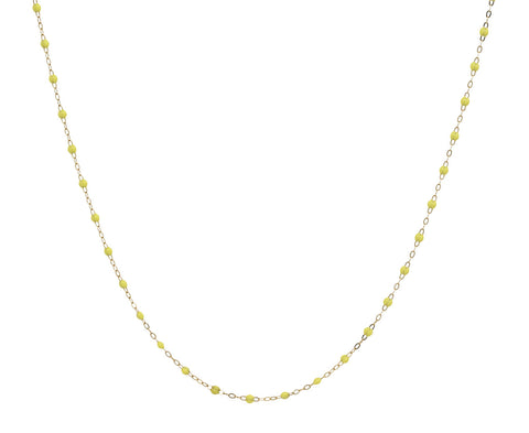 Captivating in its subtle sparkle and soft toned color palette, this Gigi Clozeau necklace exudes a quiet luxury. Set along the adjustable 18K yellow gold chain are tiny drops of pale yellow resin. Alone or layered with your other favorites, it adds a modern, timeless feel to any collection.