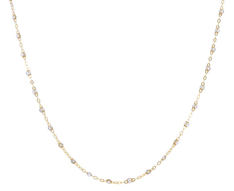 Captivating in its sparkle and neutral color palette, this Gigi Clozeau necklace exudes a quiet luxury. Set along the adjustable 18K yellow gold chain are tiny drops of translucent, clear resin. Alone or with any of her pendants, it adds a modern, timeless feel to any collection.