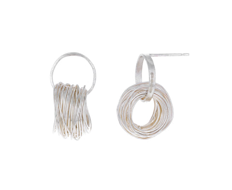 Playful, casual, and a modern answer to traditional hoops, these Disa Allsopp earrings also have an eye catching design. Thin sterling silver wire wraps around and around to create her signature spaghetti ring. They hang from forward facing loops of sterling silver which attach to the silver posts.