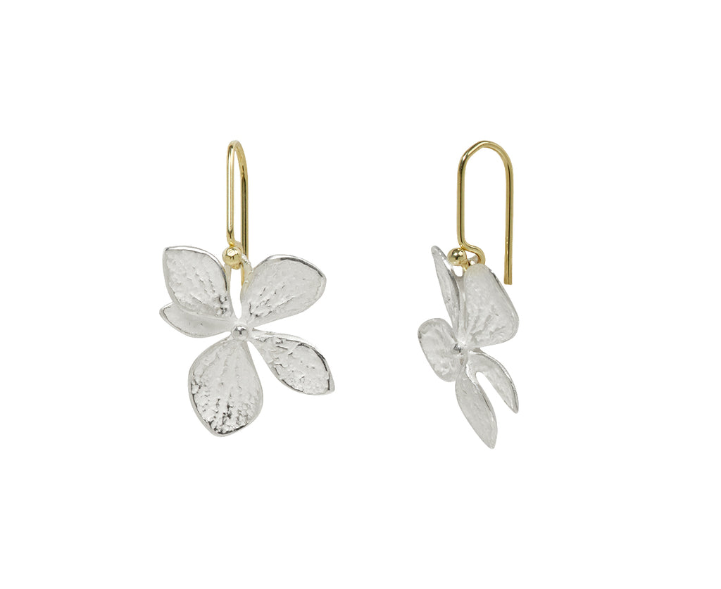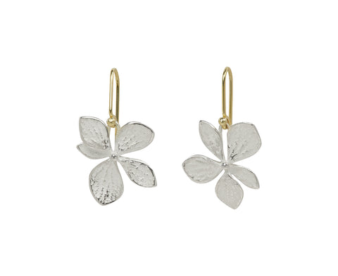 With a quiet design and subtle, earthy sophistication, these John Iversen earrings are an elegant option for every day. The meticulously detailed white silver hydrangea blooms dangle beneath 14K yellow gold ear wires to create a pair of earrings with understated, earthy allure.