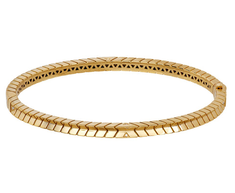 With its texture and dimension, this Harwell Godfrey bracelet has a subtly edgy vibe. The skinny, inverted knife edge 18K yellow gold bangle has been engraved with lines and triangles all along its surface and closes with an 18K yellow gold safety clasp. Each triangle is set with a tiny shimmering white diamond. This bracelet will easily fit in to any collection.