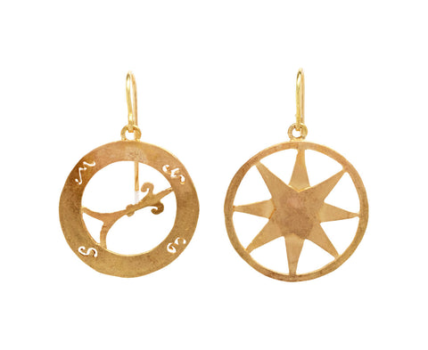 Perfectly symbolic and hand-crafted to perfection, these playful Judy Geib earrings are made for your casual side. Each 18K yellow gold compass has its own interpretation for an asymmetrical design. The cut-out discs dangle from 18K yellow gold ear wires to create a pair of fun, easy-to-wear earrings.
