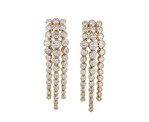 With their striking, modern sophistication, these ONDYN earrings are a stunning alternative to any diamond earrings. Cascading from 14K yellow gold posts are a tapered series sparkling white diamond bezel set in 14K yellow gold to create an articulated fringe cascade.