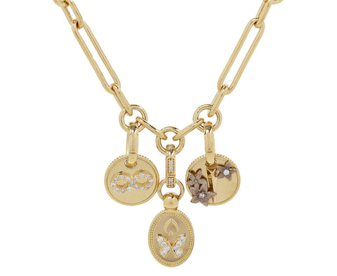 The ultimate piece of jewelry with classic versatility, this Foundrae charmed chain is a modern must-have. The continuous strand of round 18K yellow gold links are broken up by long clip links. The center three links have three mini charms attached to them. Two hang from a 18K yellow gold push gate and one hangs from a diamond push gate, making them easily removable if you desire to customize your look further. The charms are resilience, reverie and infinity. Talismanic and bold this necklace is a striking way to tell your story.