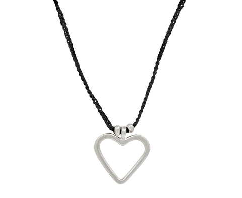 This sweet and organically inspired Jill Platner necklace is a thin, dime sized hand-sculpted and open heart that hangs from a crocheted cord. It is 16" long and closed with Jill's signature toggle closure. Go ahead, wear it in the shower, pool or surf. It's durable and ready for action.