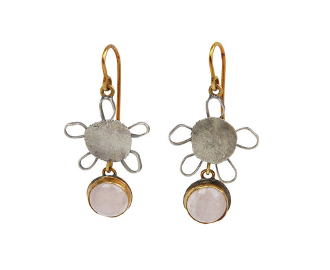 Earthy but elegant, these Judy Geib earrings have a sweet, style-defining presence. Her signature airy, sterling silver flowers are anchored by smooth, rose quartz set in 18K yellow gold bezels. They hang from 18K yellow gold ear wires.